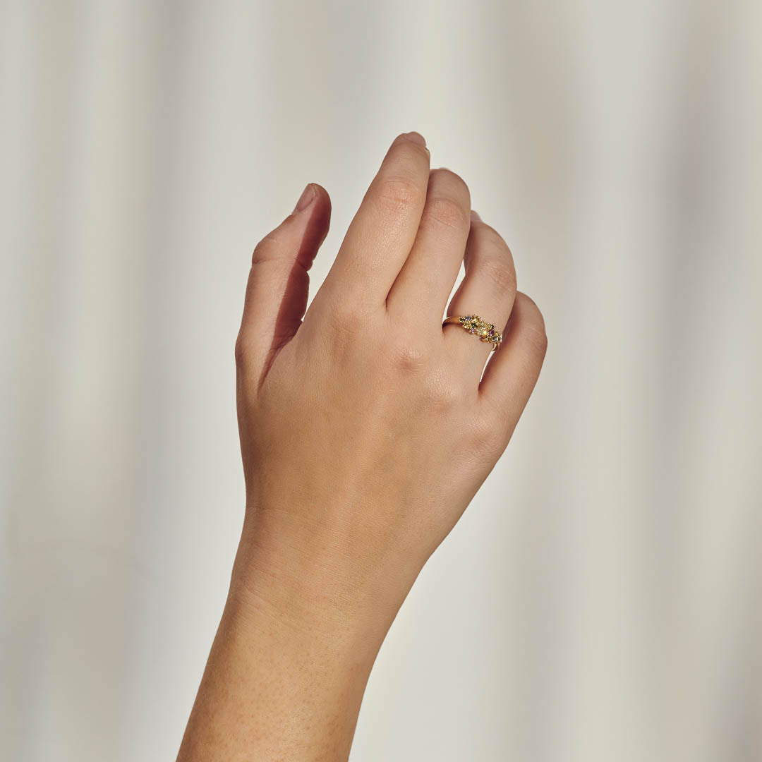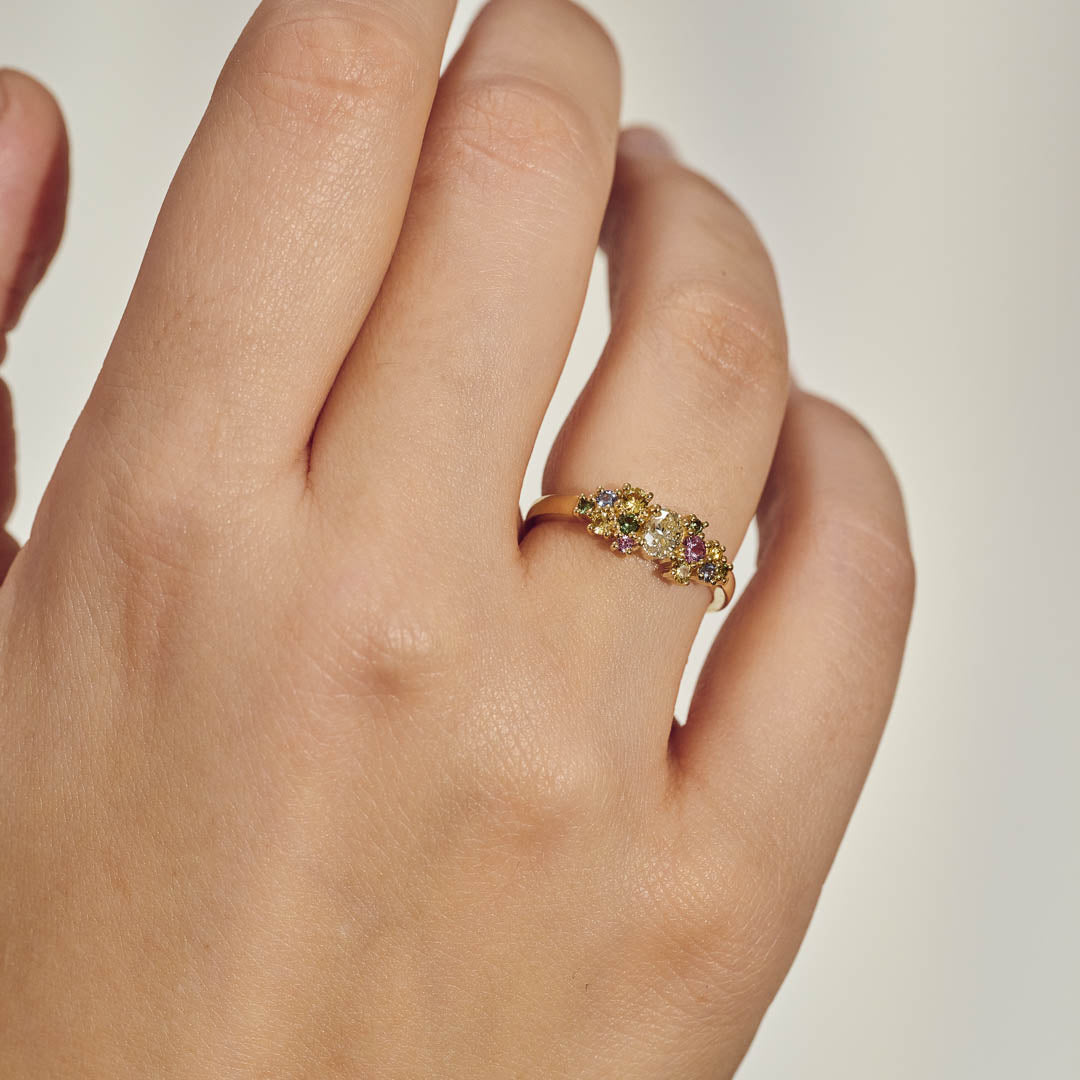 Botanica's first Diamond Bouquet ring, a joyful creation inspired by the beauty of a fresh bouquet of flowers. Smile each time you look at the colours of these sapphires and this warm toned diamond, just as you smile when walking into a room with fresh blooms.