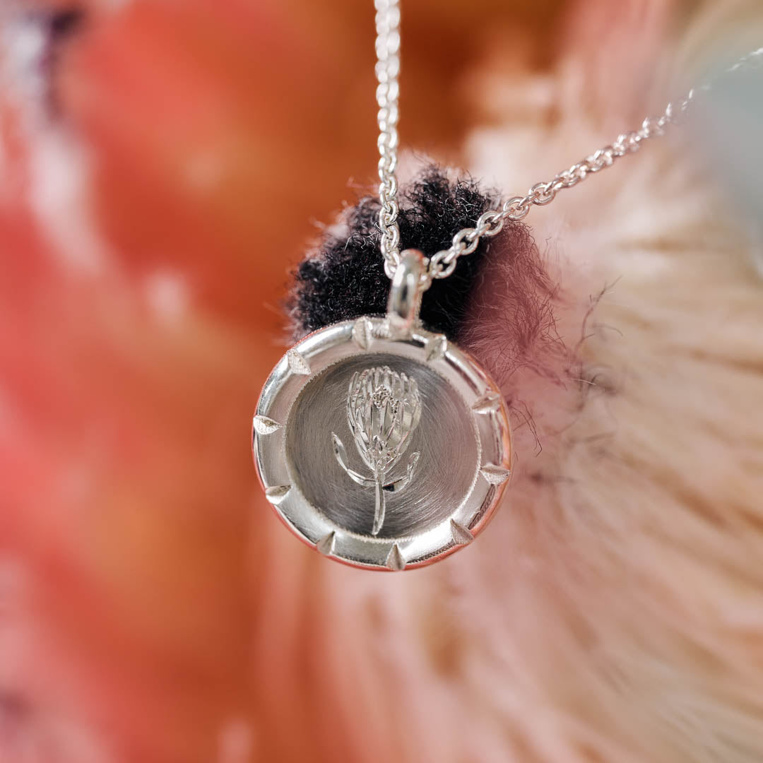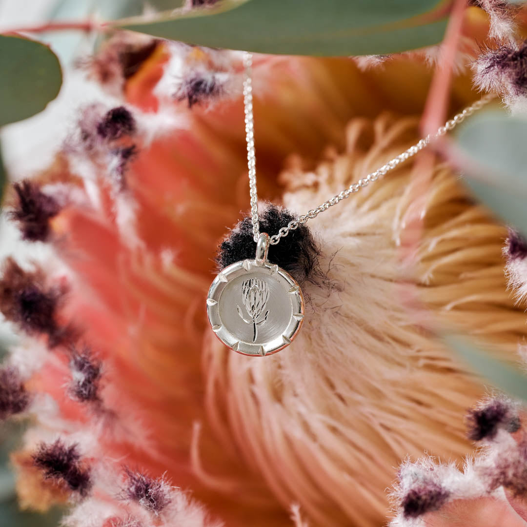 These sweet little pendants are the petite version of our original Wild Flower Pendants, a product of a passion for South Africa's beautiful flora and its skilled artisans. Each pendant is carefully hand crafted and then expertly hand engraved with an original illustration drawn specifically for this range making them completely unique pieces of art to be worn for many years. Manufactured with enough thickness to endure regular wear and supplied with a high quality Italian chain.