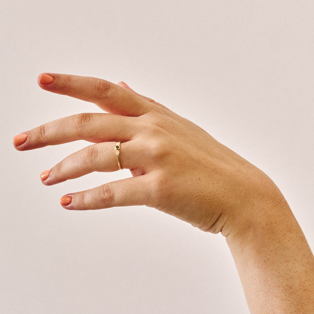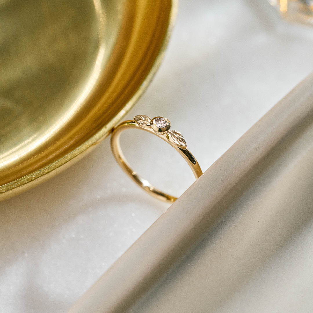 This ring features a natural diamond with a tube setting and two delicate leaf details on either side. It has been designed to make the perfect stacking ring to be worn with our other stackable rings or worn alone as an elegant everyday accessory.