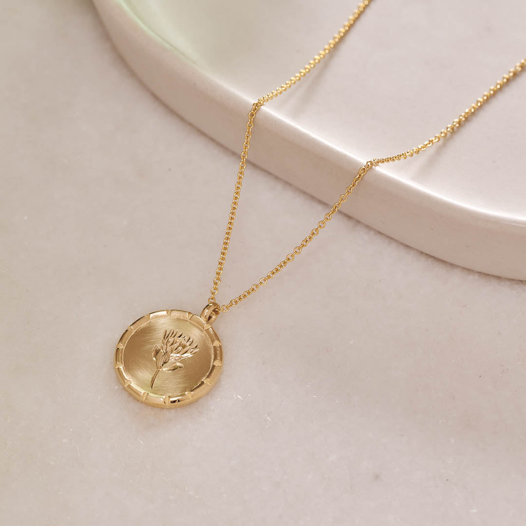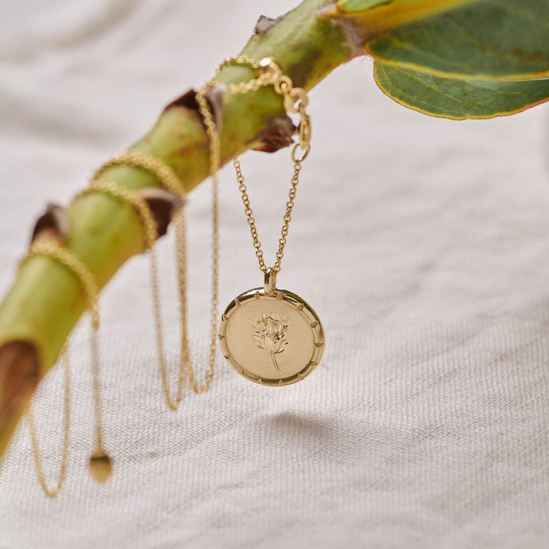 These precious pendants are the product of a passion for South Africa's beautiful flora and its skilled artisans. Each pendant is carefully hand crafted and then expertly hand engraved with an original illustration drawn specifically for this range making them completely unique pieces of art to be worn for many years. Manufactured with enough thickness to endure regular wear and supplied with a high quality Italian chain.