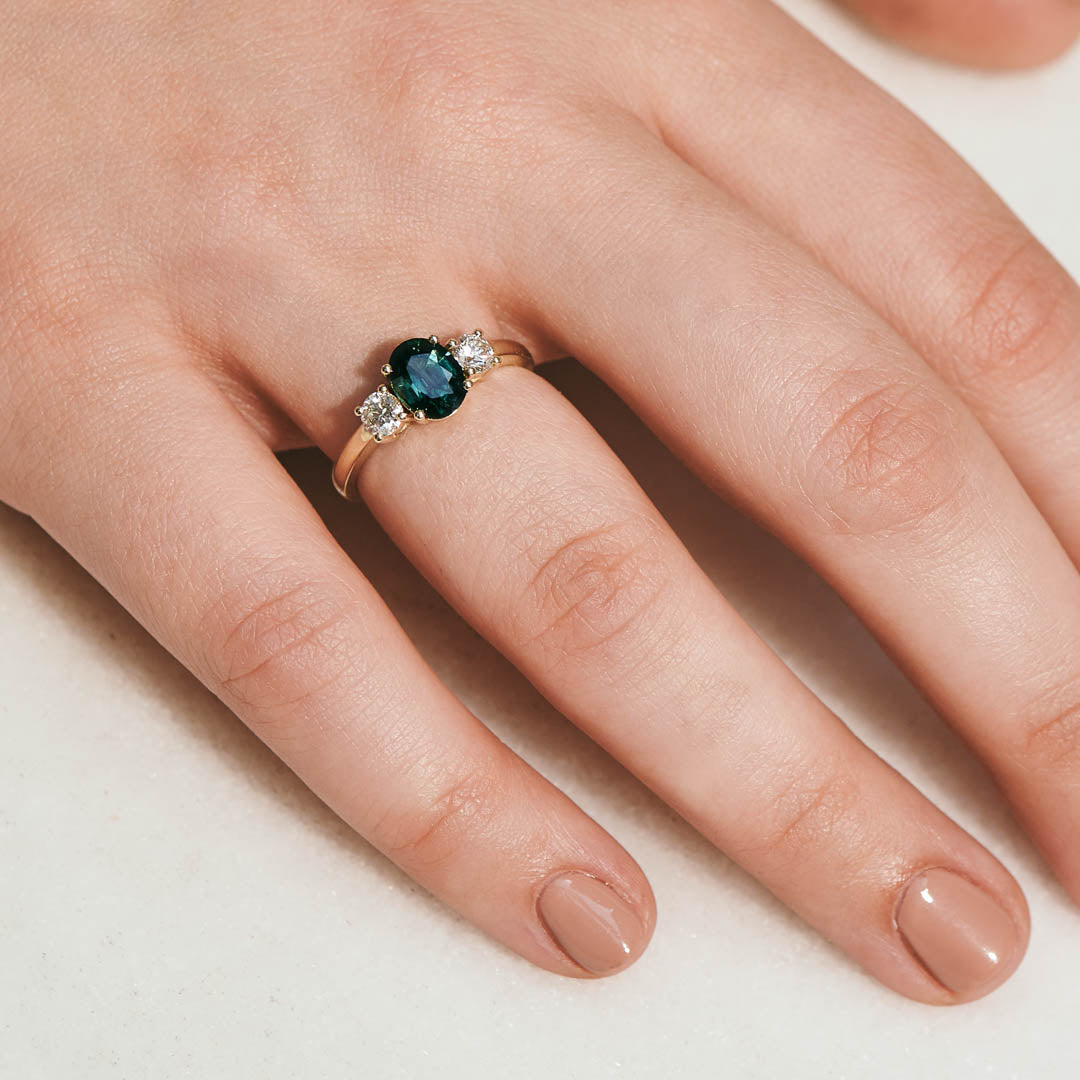 A stunning oval green sapphire flanked by two round brilliant diamonds set in a 14ct yellow gold. Hand made in the time honoured traditional way from beginning to end.