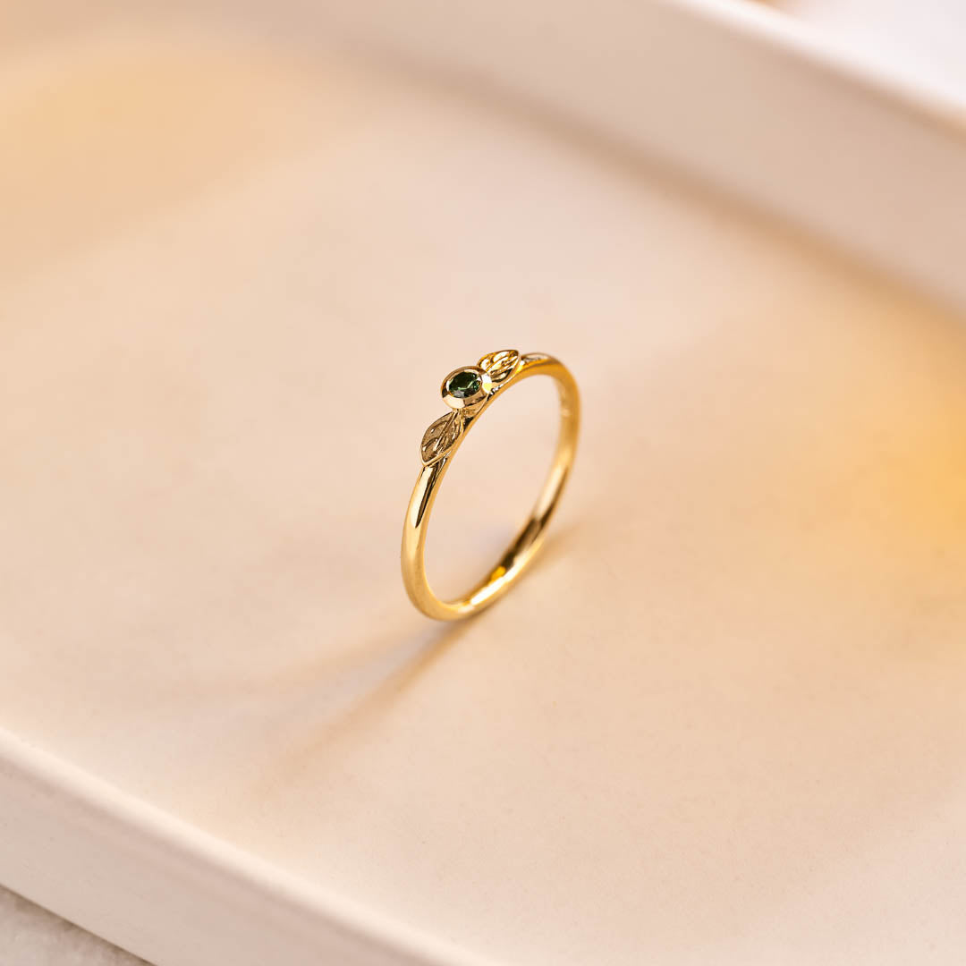 This ring features a green sapphire with a tube setting and two delicate leaf details on either side. It has been designed to make the perfect stacking ring to be worn with our other stackable rings or worn alone as an elegant everyday accessory.