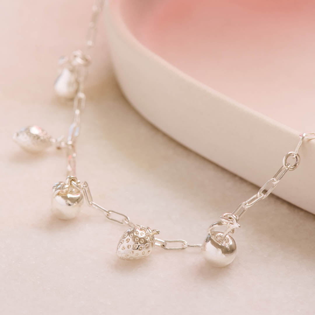 Our Seasonal Fruit Charm Bracelet offers a beautiful way to wear a curated selection of our seasonal charms, each one a tribute to the fruits we reach for in each season. The five-charm bracelet includes the pear, lemon, apple, strawberry and cherry charm.