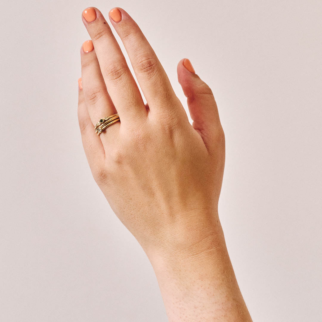 Our Stack Ring bundle consists of our three most loved stackable rings. Our Diamond Stack Ring, Sapphire Two Leaf Stack Ring, and Classic Ring have all been designed to make the perfect stacked set when worn together. They can also be worn individually as an elegant everyday accessory. Our Stack ring bundle is a cost-effective way to collect all three of our stack rings.