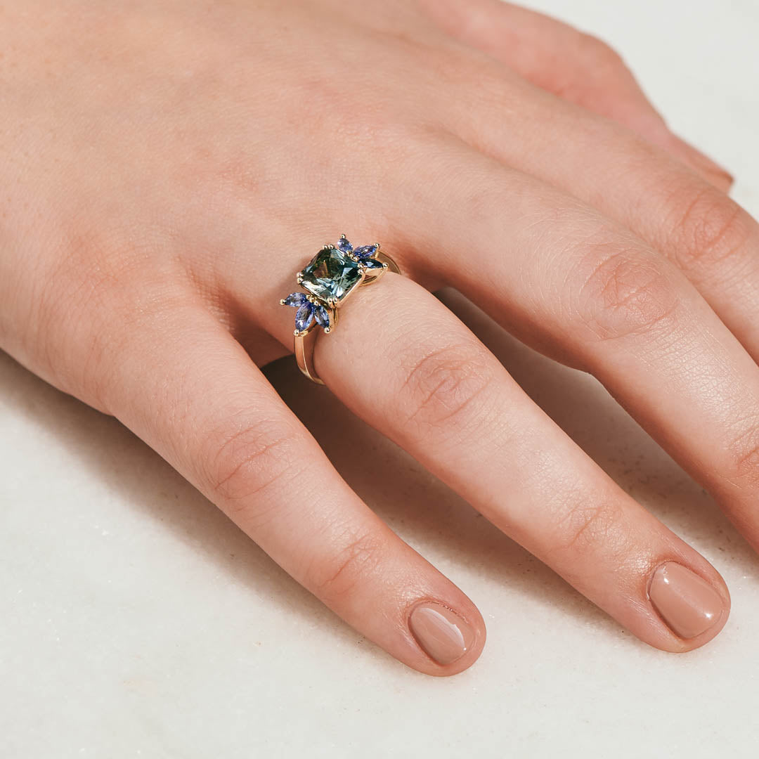 A striking one of a kind ring for someone who wants a design that makes a statement but remains classic with our subtle botanical design elements. A unique Tourmaline with a distinctive greyish green colour is flanked by six blue marquise sapphires, the two colours beautifully complementing each other.